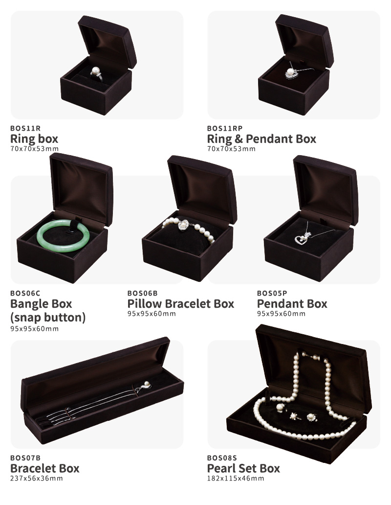 The Japan-imported jewelry box series is made with premium-quality flocked material, offering a smooth and refined touch. The collection includes ring box, pendant box, pearl set box, and more.