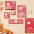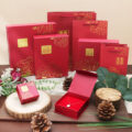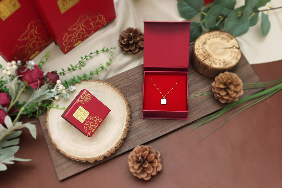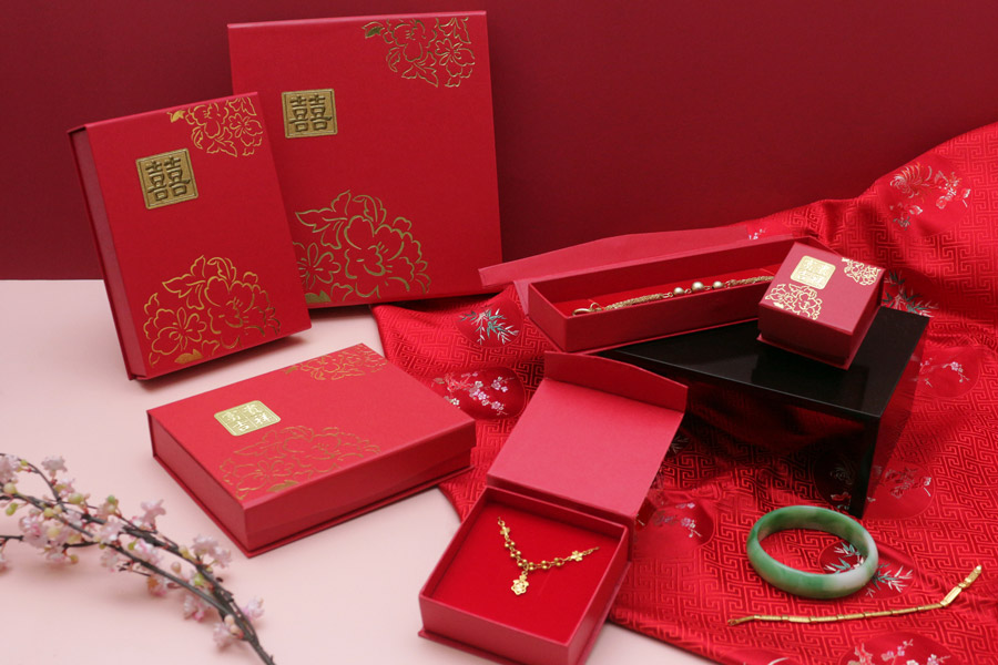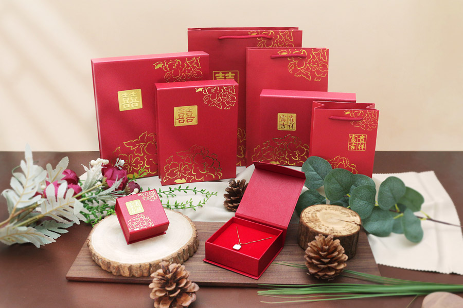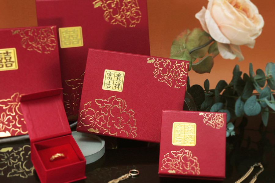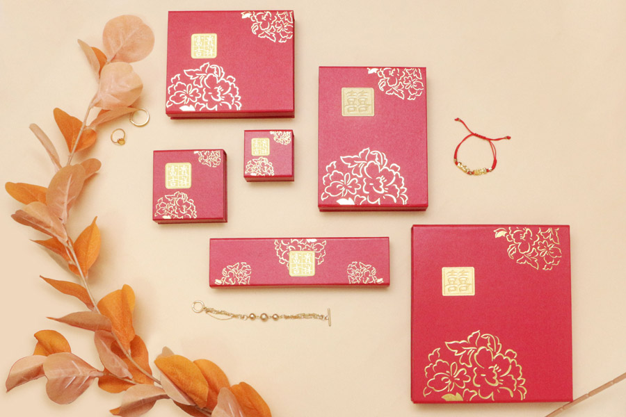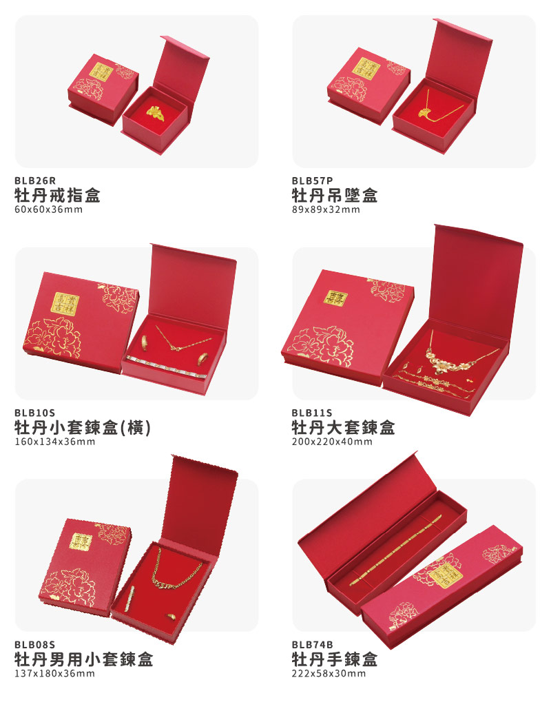 牡丹系列盒款,盒面有獨家設計專屬立體貼紙,為整體盒款增添立體層次。福氣滿滿的紅色美術紙張與盒面燙印牡丹圖樣,經典不敗款式,是黃金銀樓店家的最愛。多種盒款可挑選:戒指盒/吊墜盒/套鍊盒/手鍊盒,符合店家多樣化的包裝選擇。