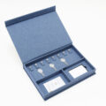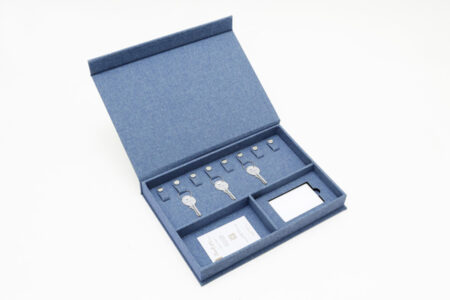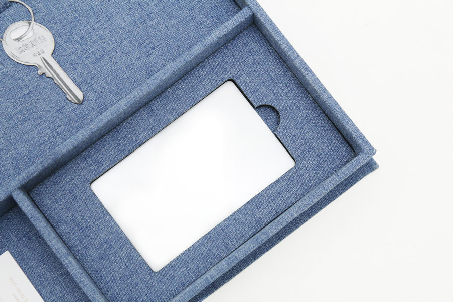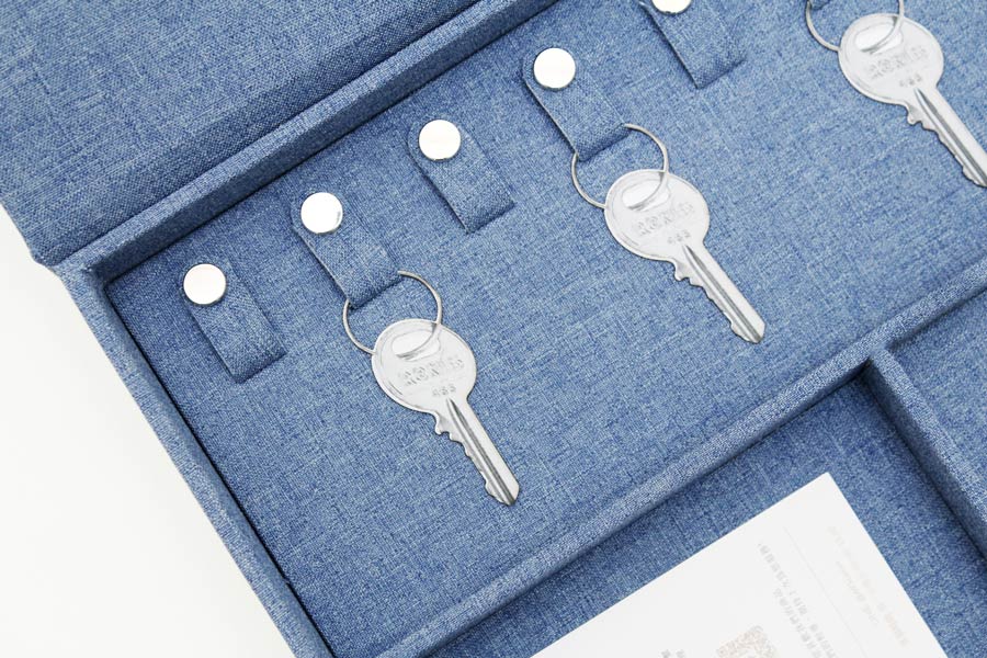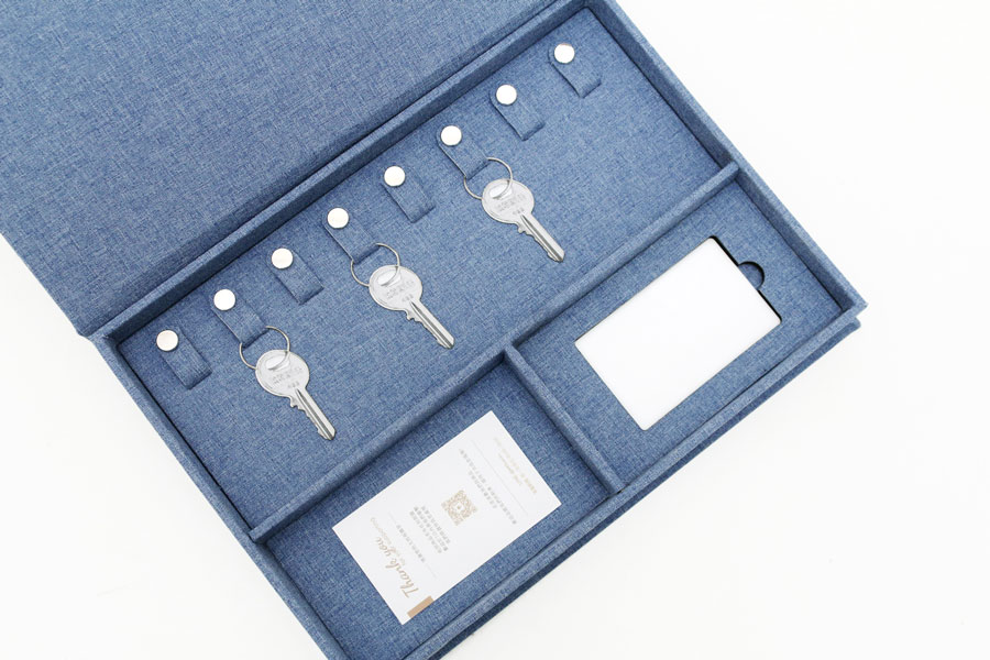 可依需求訂製的精裝交屋禮盒。單層設計依據客戶需求規劃,內有:鑰匙扣環、名片收納空間、IC卡挖槽。提供多樣化材料挑選,尺寸及內裝規格等都可以客製化,另可印製上品牌LOGO。