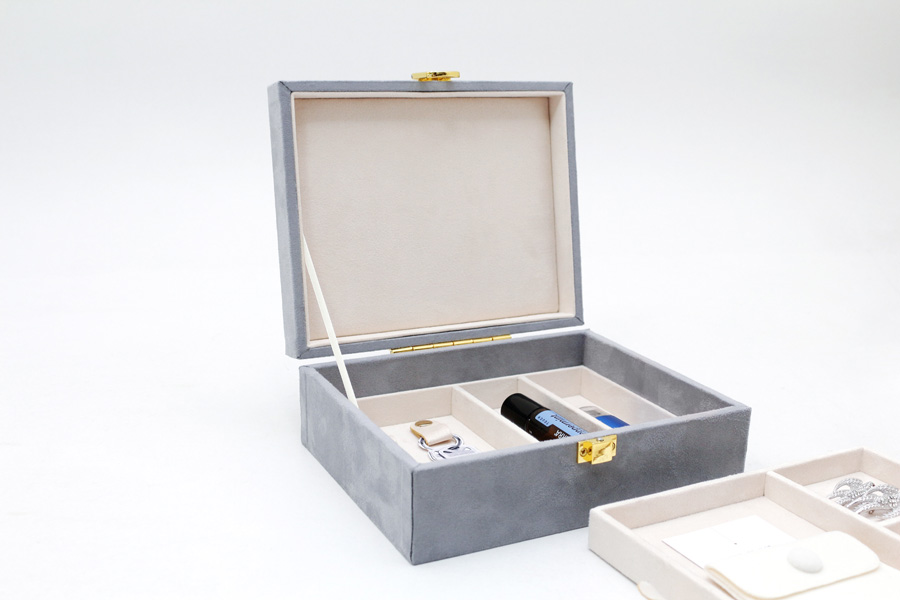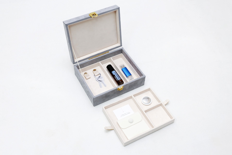 這款手工製作的雙層交屋盒,以灰白撞色絨布為外觀,結合輕巧結構與實用收納機能,專為室內設計師交屋需求量身打造,可根據品牌需求客製 LOGO。