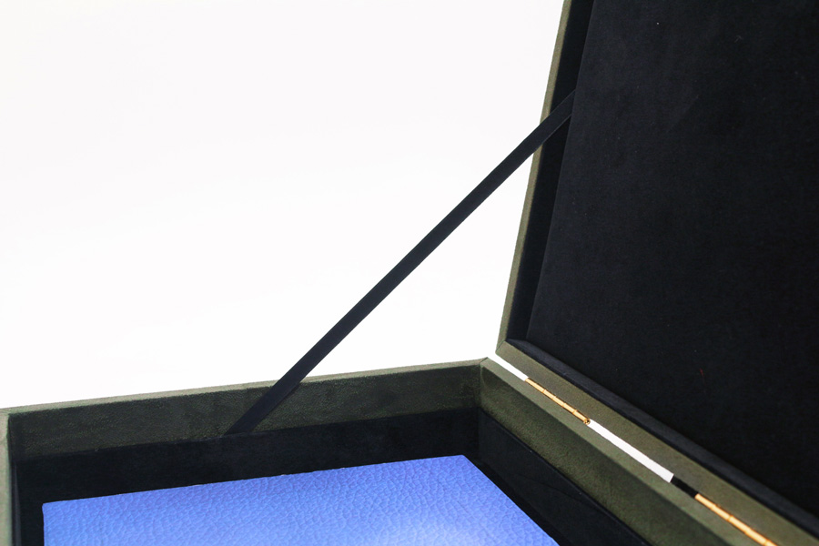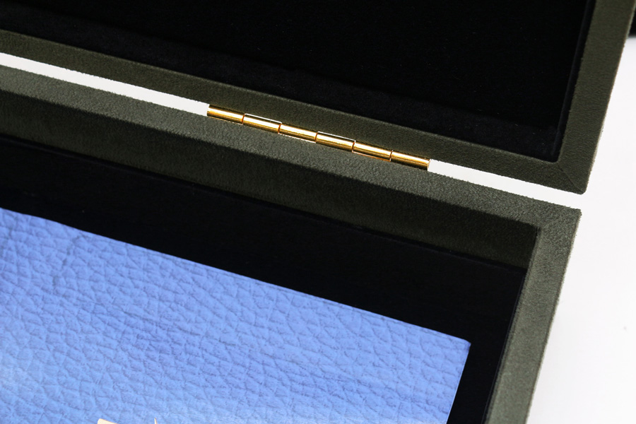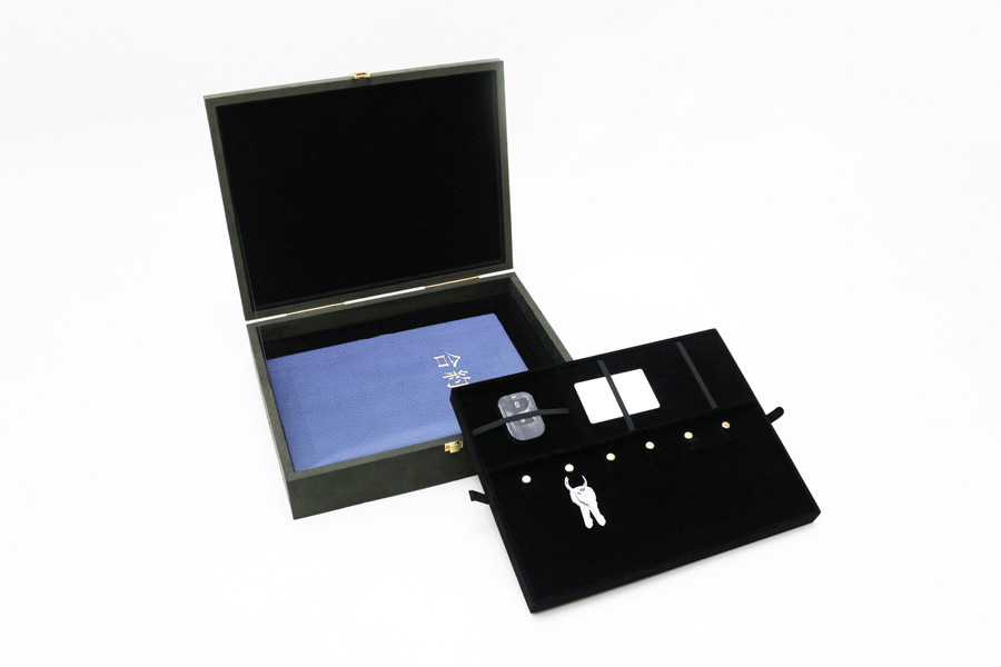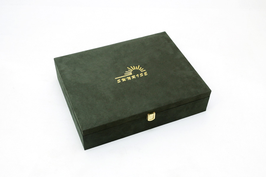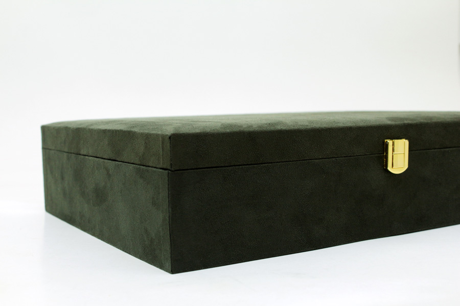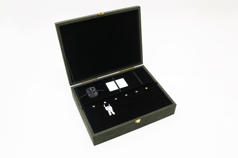 此款交屋盒以深綠色麂皮絨包覆,外觀沉穩大器,並具備多功能收納空間,適合建案交屋、設計師提案、精品贈禮等場合。內裝可依照品牌需求客製,收納鑰匙、感應器、卡片、合約書等等。