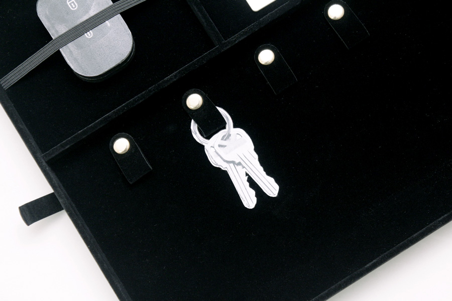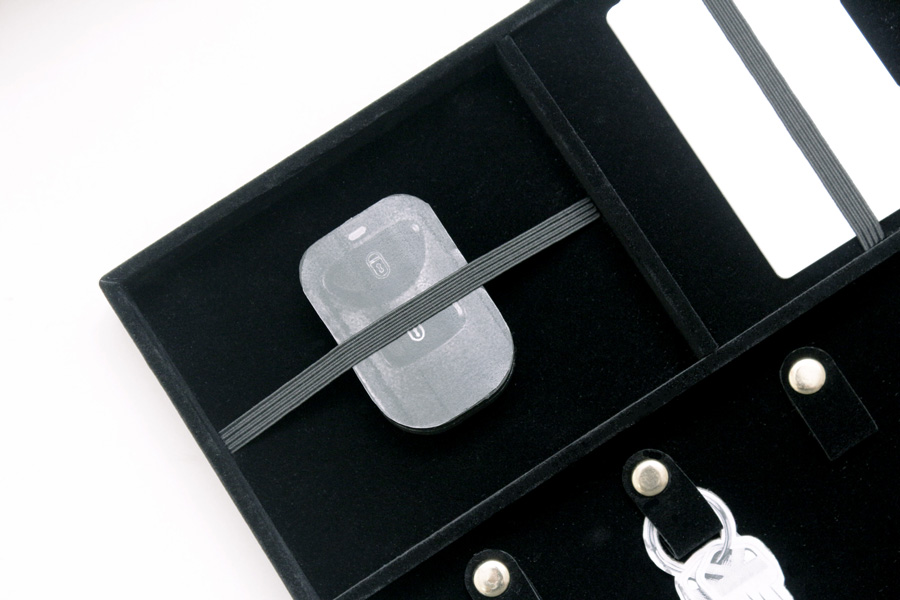 – 上層內盒:含鑰匙釦、鬆緊帶夾層,固定鑰匙、感應器與卡片等。