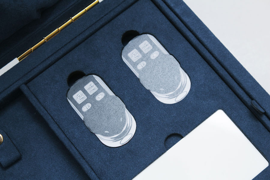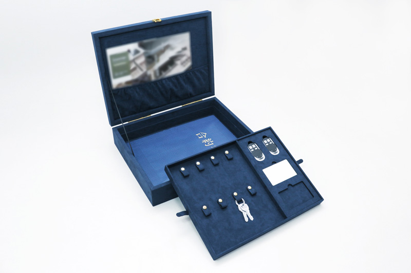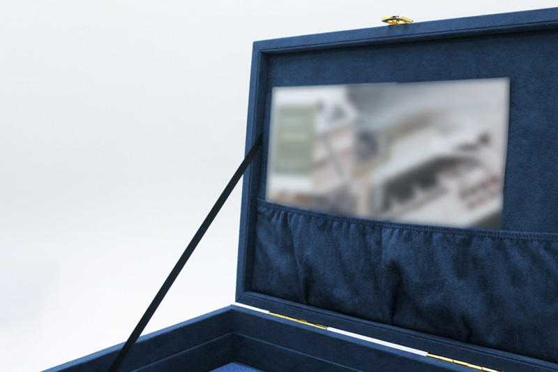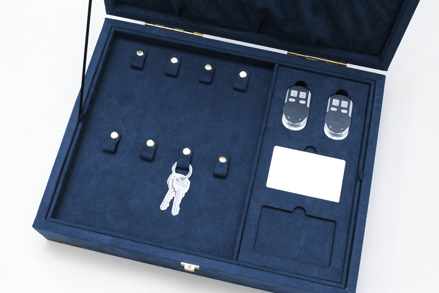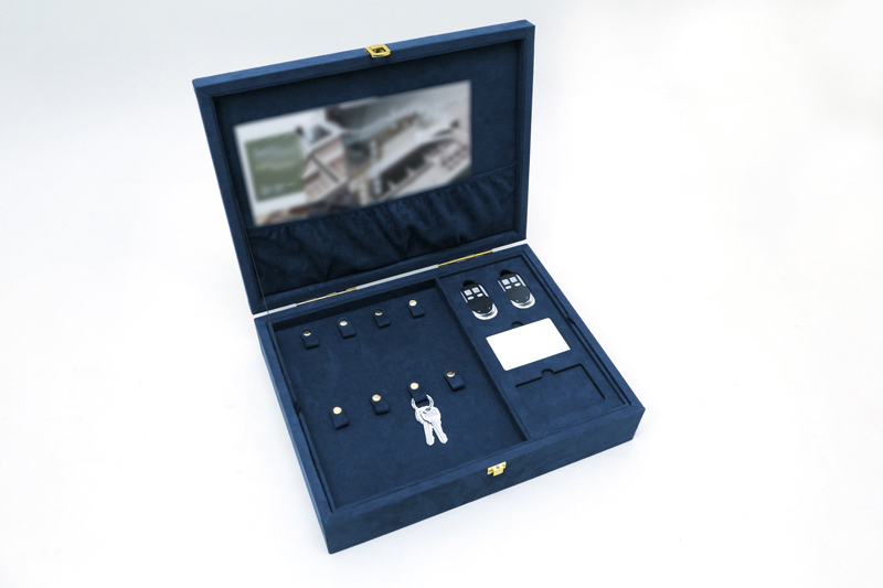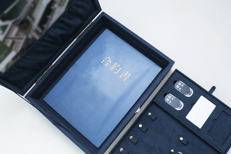 此款訂製交屋盒採用深藍色麂皮絨包覆,質感厚實,內裝為雙層式設計,專為建案交屋、豪宅贈禮與高端品牌提案而設計。盒蓋內附鬆緊袋可放置文件或簡介,底層與抽屜皆可依需求配置多種收納結構(鑰匙、感應器、卡片、合約書)。