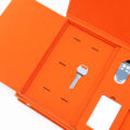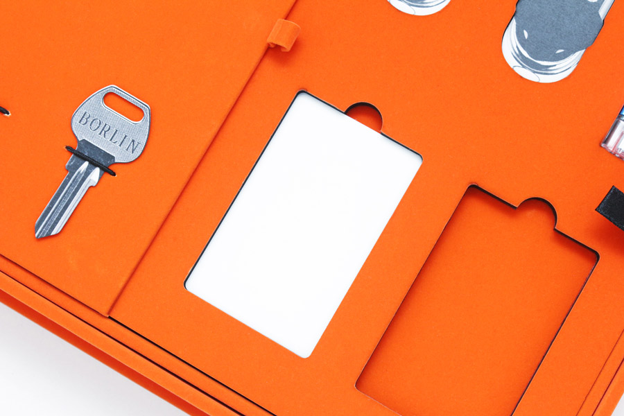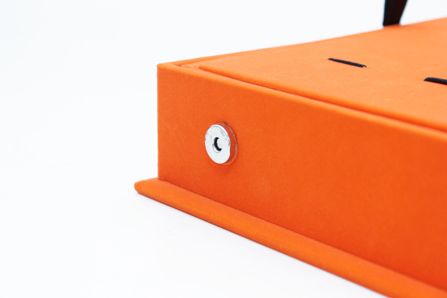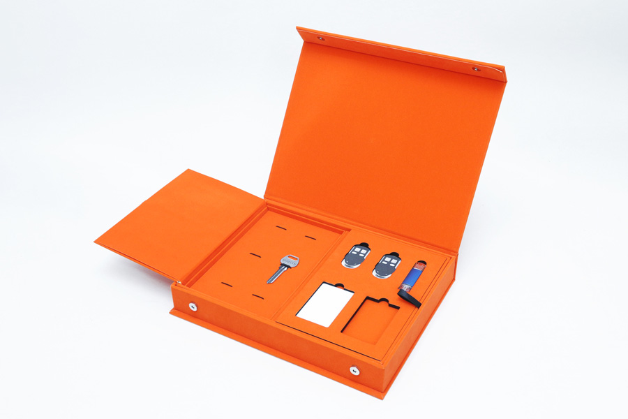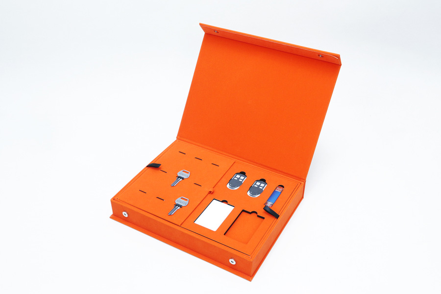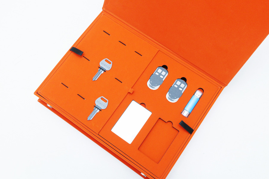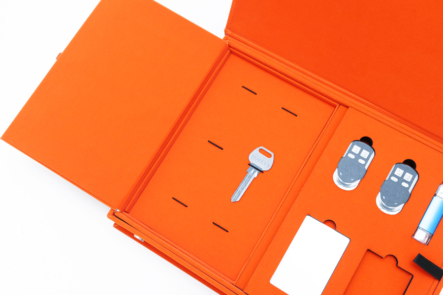 選用珠寶等級質感的麂皮絨製成,手感細緻,呈現品牌高端質感。鑰匙收納區域採用特殊翻蓋設計,可同時收納多把鑰匙、分門別類擺放,一目了然。精準開孔設計,門禁卡及車庫鑰匙等都可輕鬆卡入,不怕脫落。雙層設計連合約書都可以放得下,是建商交屋首選交屋盒款。