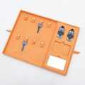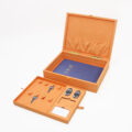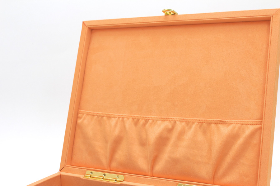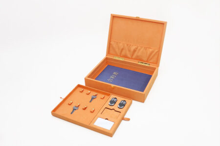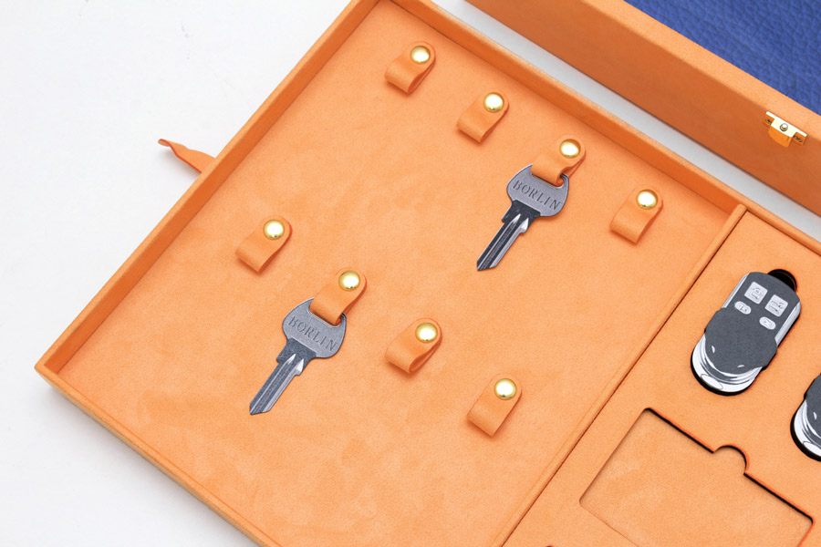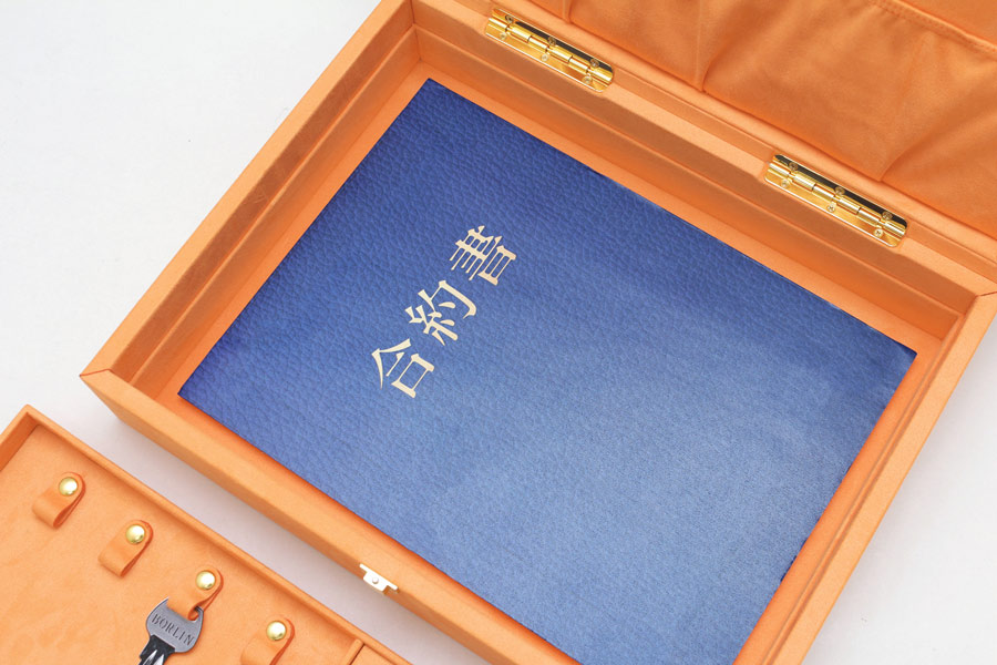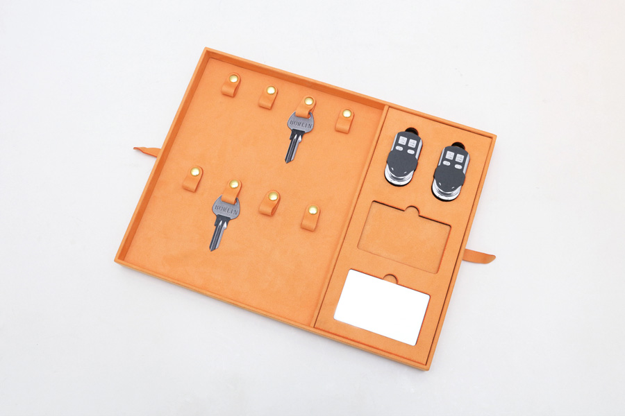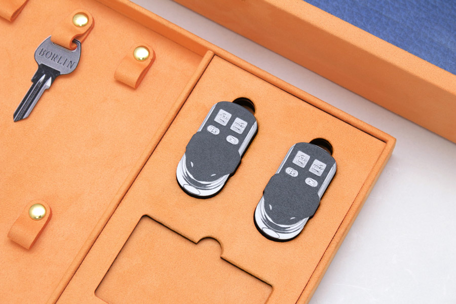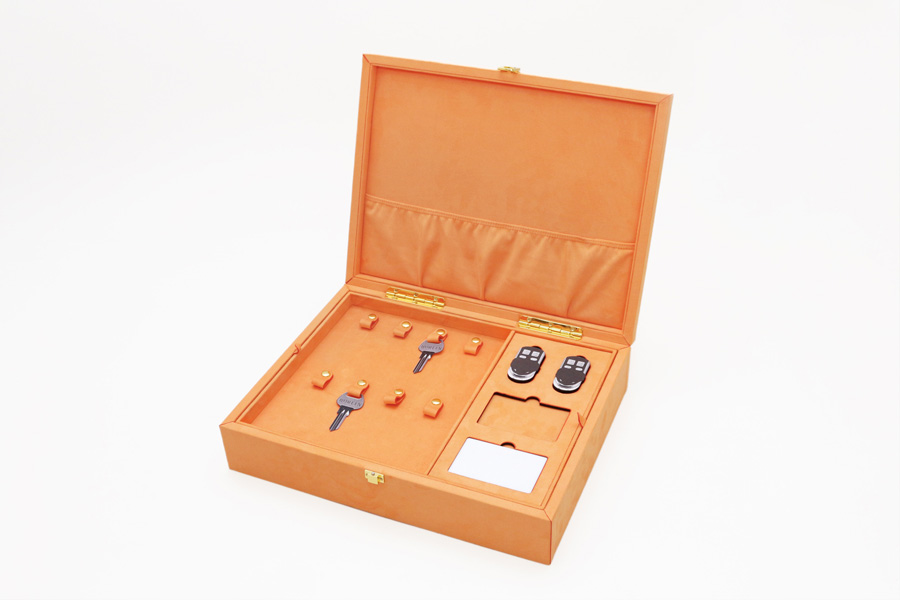 以木胚成形並外包珠寶等級麂皮絨的精裝交屋盒,台灣在地工廠純手工打造,可依據需求客製尺寸、材質及規格等,是建商及設計師交屋必備用品之一。內裝規格專為交屋用品設計,鑰匙附有扣環設計,車庫鑰匙及門禁卡皆可精準開孔,物品可輕鬆卡入、不掉落。
